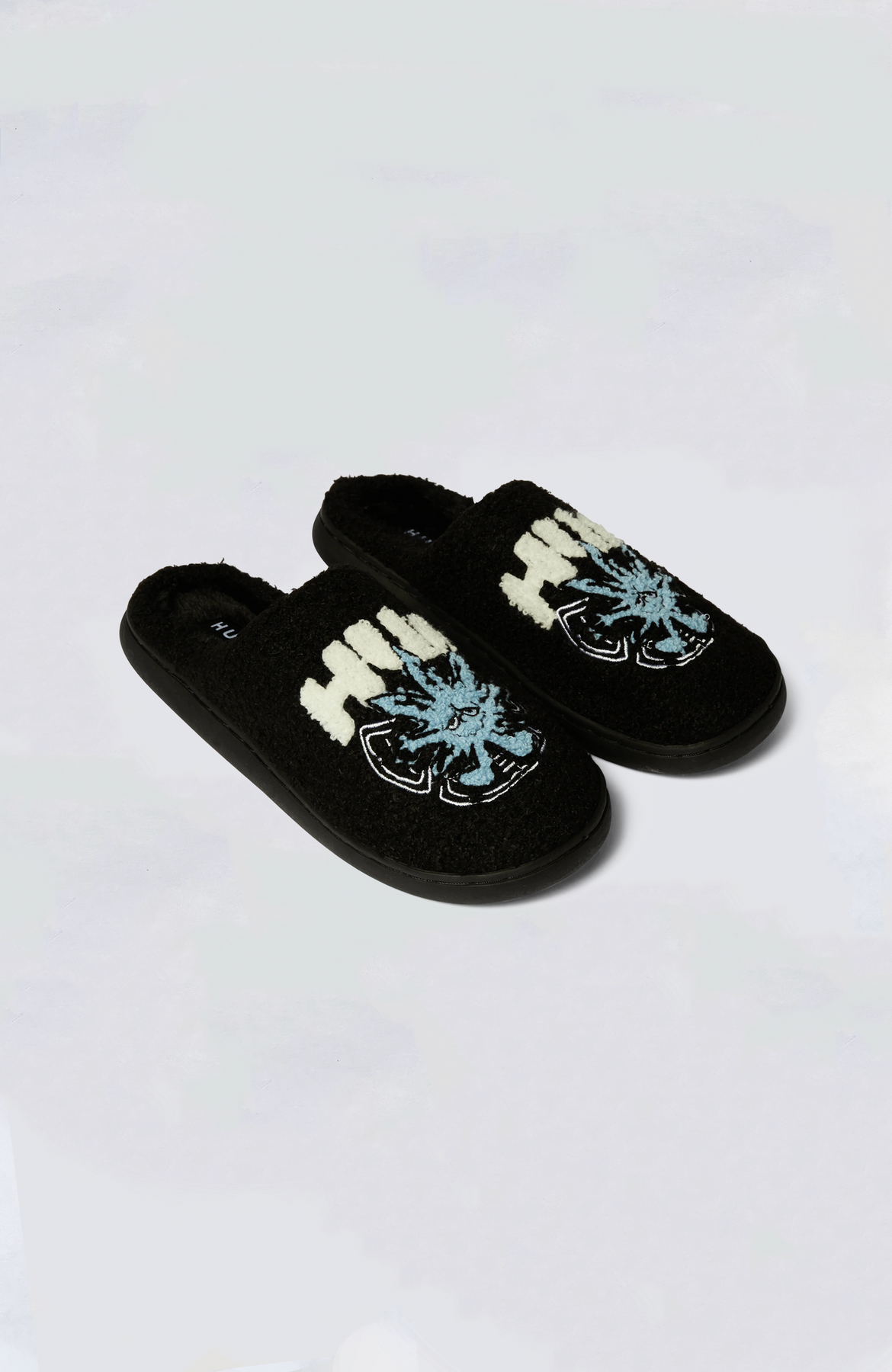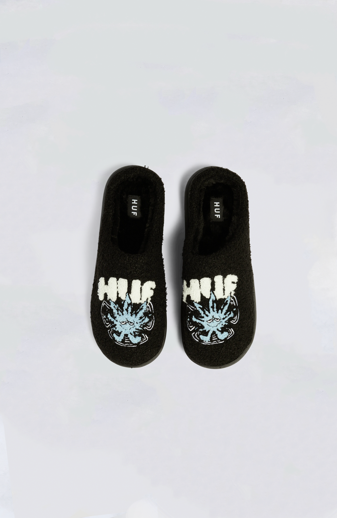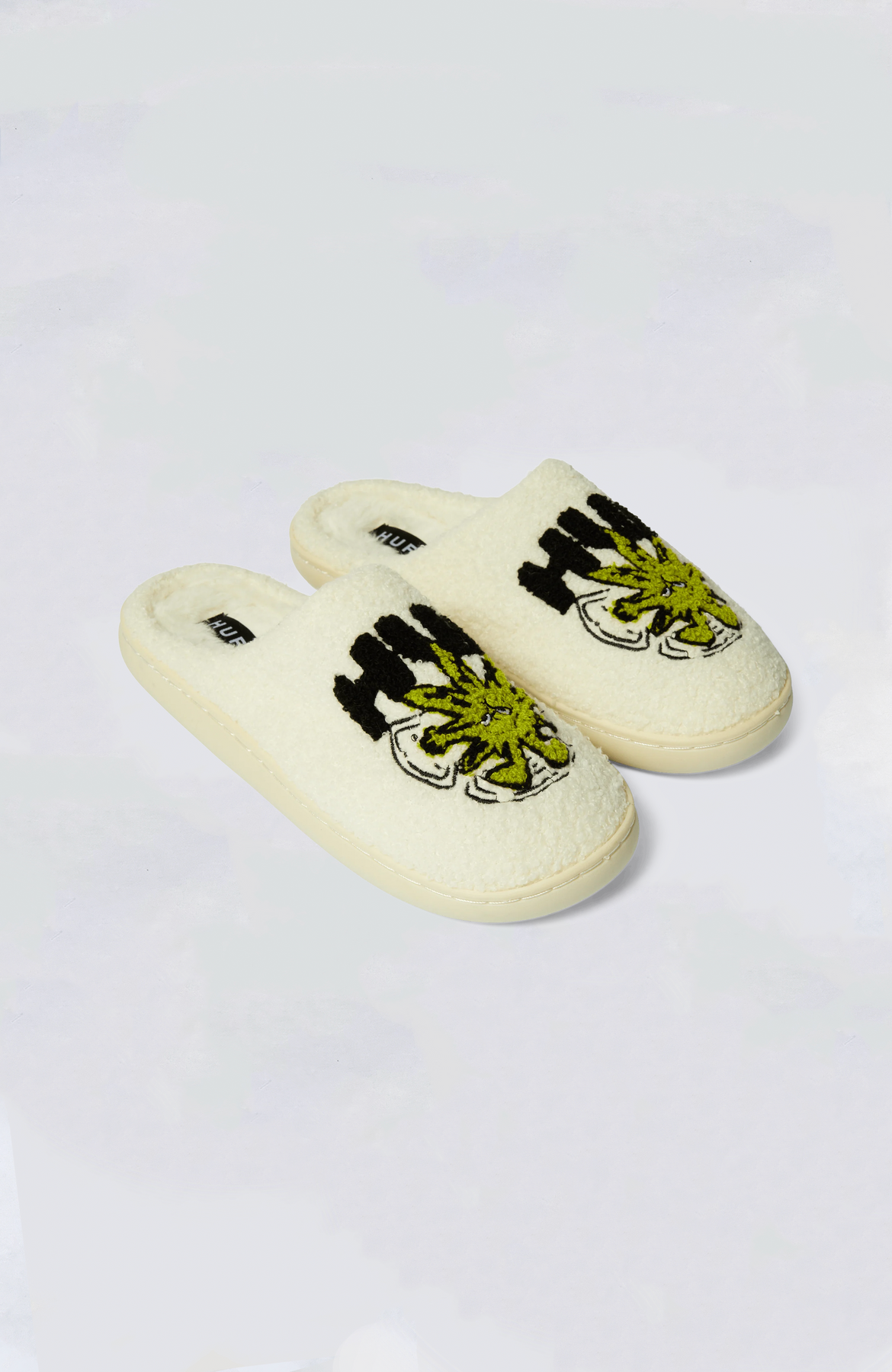 HUF ultra-cozy fuzzy-lined slipper featuring 'Green Buddy' artwork and HUF branding.