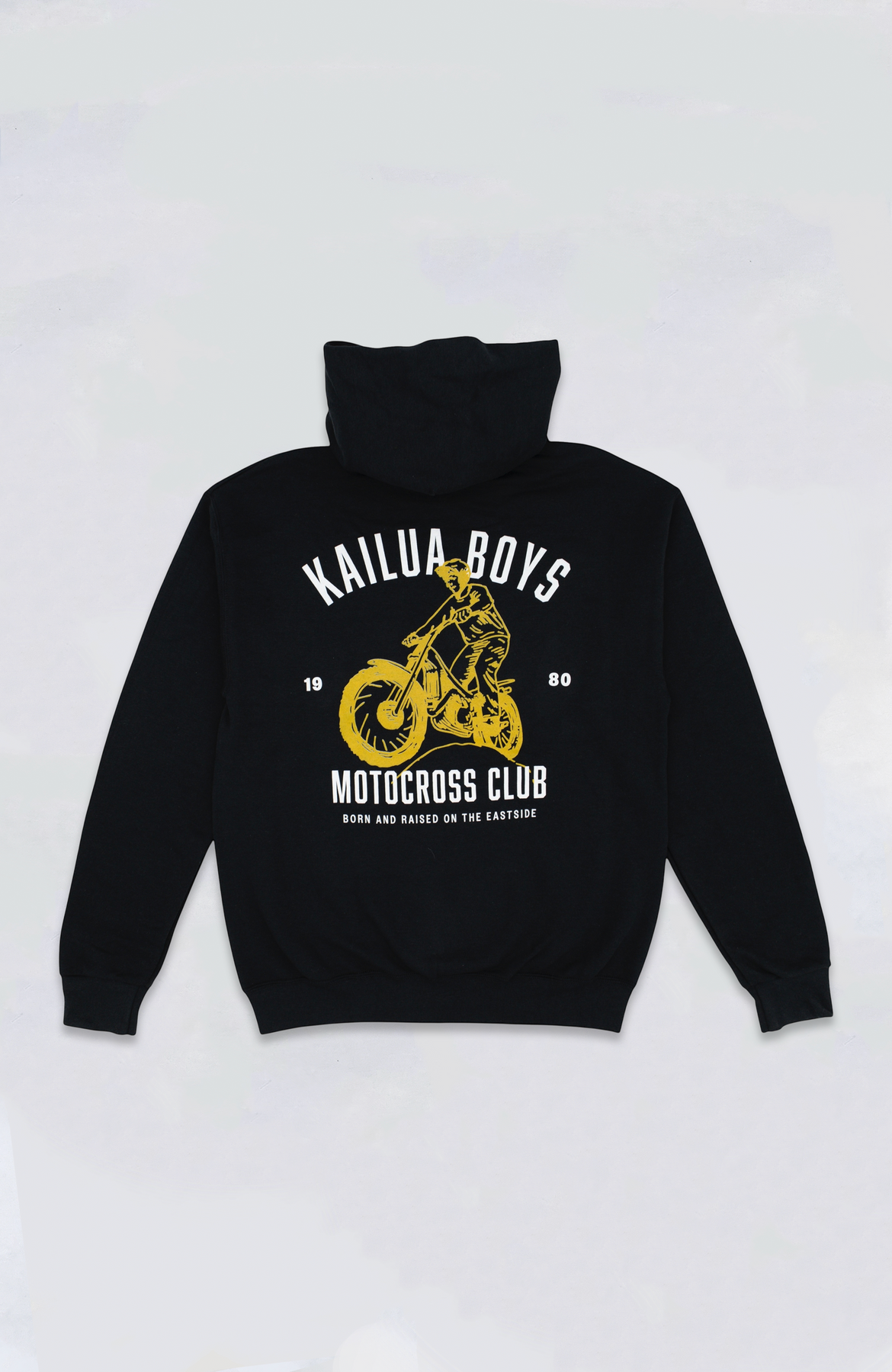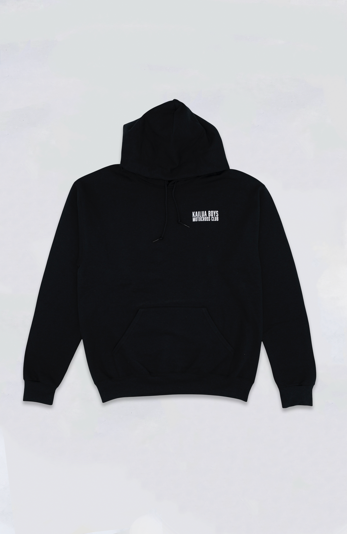Kailua Boys heavyweight pullover hood sweater featuring a large KB Motocross Club screen print on the back and a small KB Motocross Club logo print on the front.