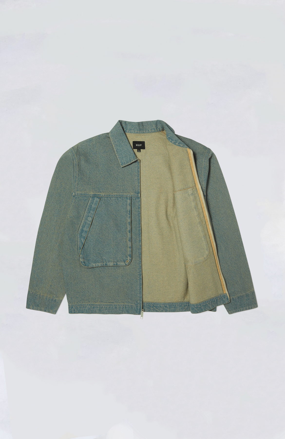 Worn in look, premium feel, the Dresden Denim Work jacket features a vintage wash and hip-length cut with custom HUF details.