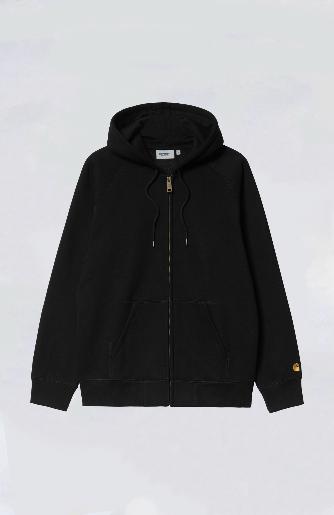 The Hooded Chase Jacket is constructed from heavyweight polycotton jersey in a regular fit. The fabric has also been brushed, giving it a fleece-like backing. The item features raglan sleeves and is detailed with flatlock stitching. An embroidered 'C' Logo appears on the left sleeve.