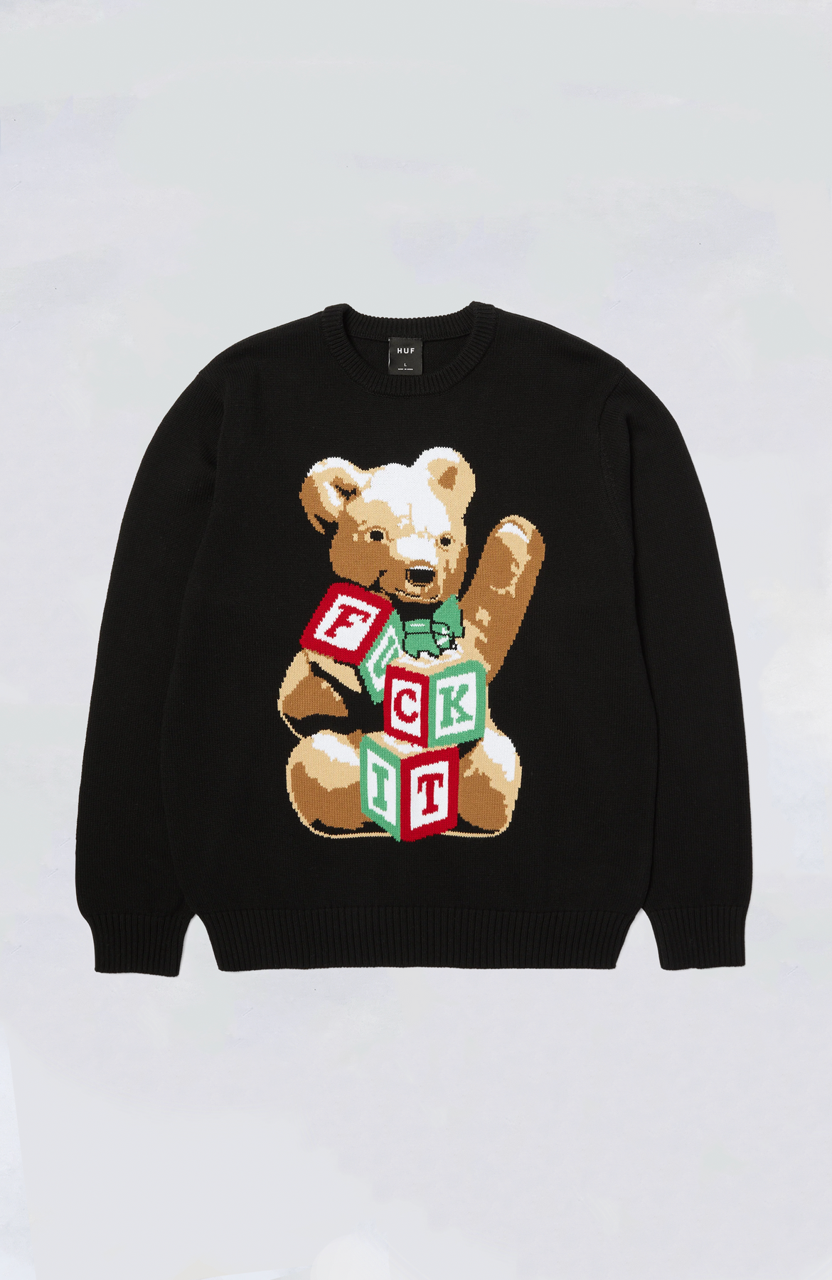 Summing up the holiday craze in two words, the Gift Bear Intarsia Sweater has irreverent jacquard-knit artwork, 100% cotton materials, and rib-knit details.