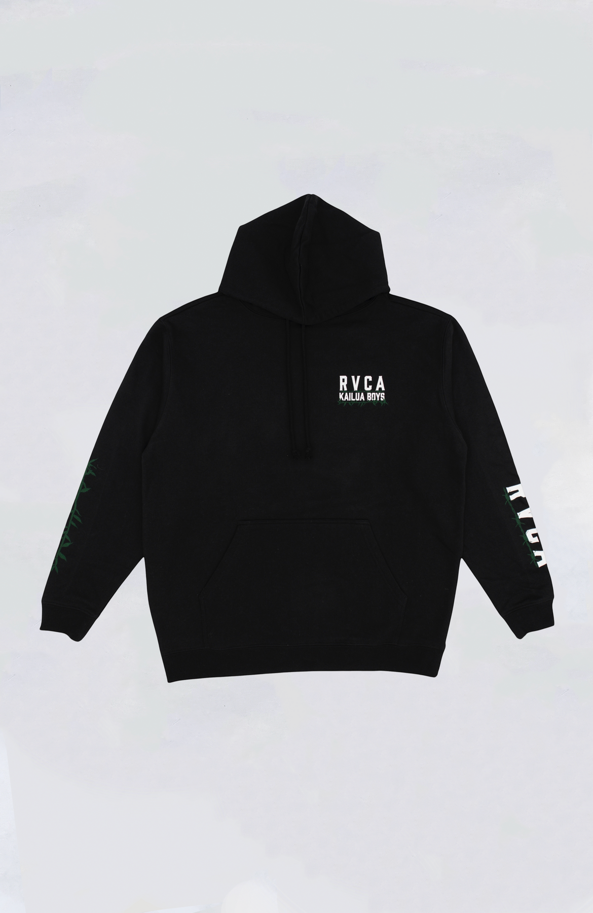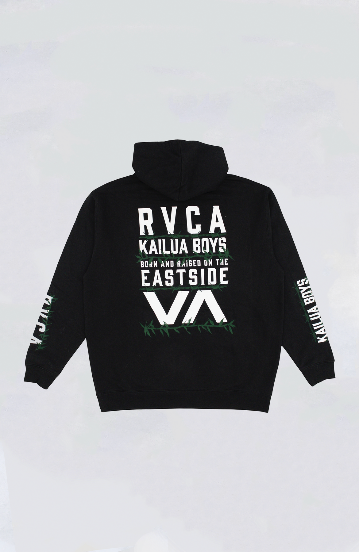 RVCA pullover hoodie featuring RVCA x Kailua Boys Barbed printed artwork on the front and back.